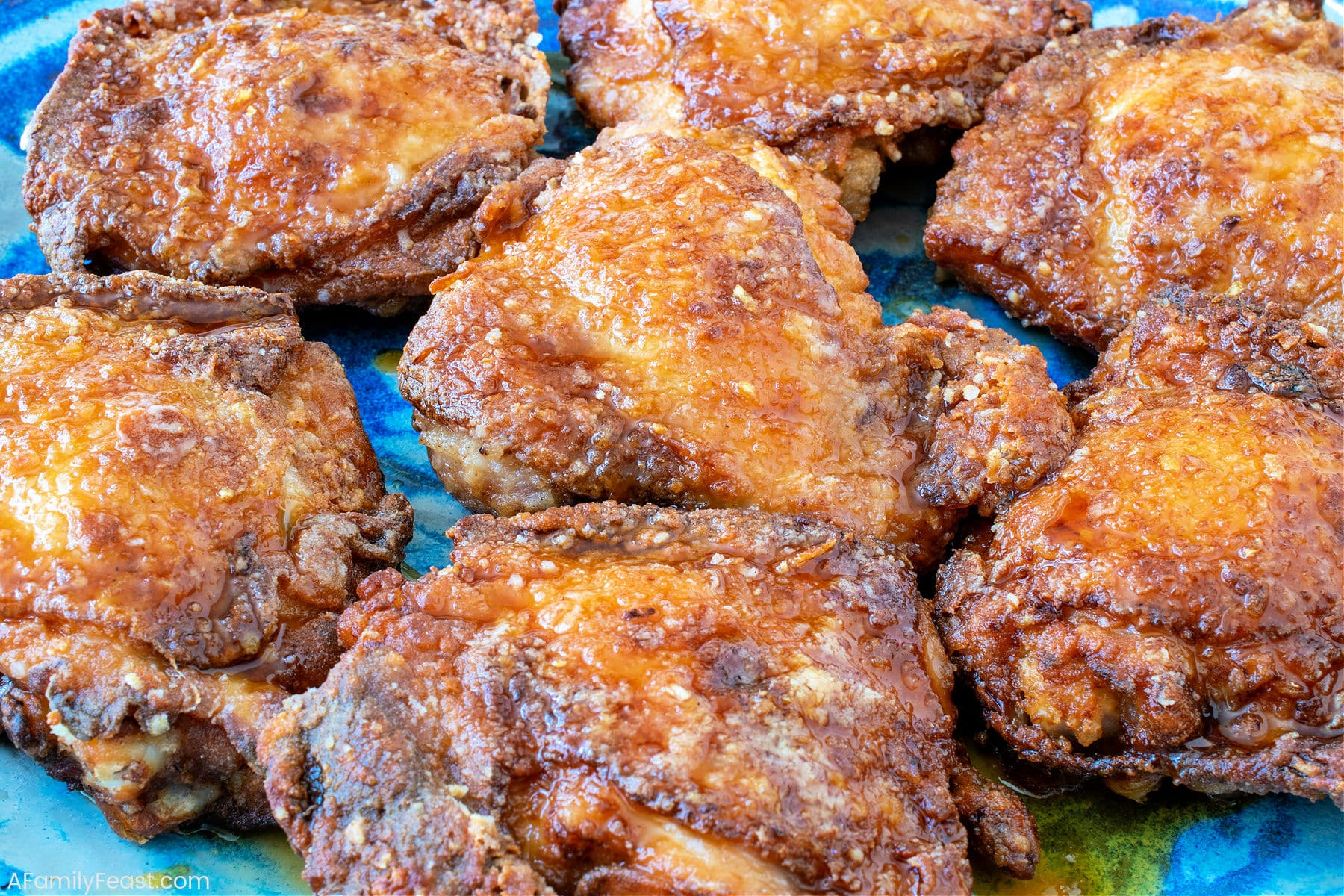 This post may contain affiliate links. Please read our disclosure policy. Crispy Asian Chicken Thighs are marinated and fried, then served with a super flavorful Asian-inspired honey soy ginger garlic sauce. Pin to save it for later! Delicious Crispy Asian Chicken Thighs We’re always trying out new chicken recipes and these crispy chicken thighs are
